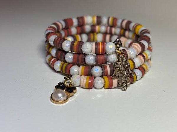 This three-wrap closed memory wire bracelet blends warm terracotta, golden mustard, and soft blush tones with shimmery white faceted beads that catch the light like a fading desert sun. The golden charms — a tiny butterfly and hand— add a playful touch to its earthy elegance. Lightweight, comfortable, and full of personality, it’s perfect for anyone who loves a warm, adventurous vibe with a hint of whimsy.