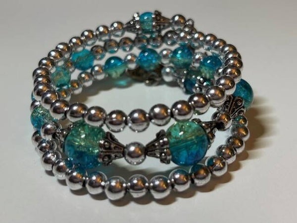 This three-wrap closed memory wire bracelet shimmers with the cool elegance of a frosty winter morning. Metallic silver beads create a radiant frame for the icy aqua-blue crackle beads, which glisten like frozen lakes under sunlight. Delicate silver snowflake charms dangle gracefully, adding a touch of wintry magic with every movement.