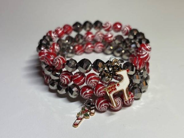 This three-wrap closed memory wire bracelet brings holiday magic to life with a swirl of candy-striped red-and-white beads and faceted gunmetal colors that sparkle like winter nights. Dangling charms — a cheerful reindeer and a candy cane tied with a bow — add a playful, nostalgic touch reminiscent of classic Christmas stories.