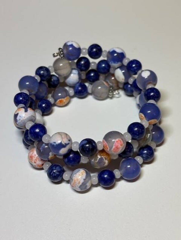 This three-wrap closed memory wire bracelet evokes the quiet majesty of a starry night meeting a painted landscape. Deep navy-blue beads anchor the design like a night sky, while marbled stones in soft grays, whites, and earthy golds swirl like clouds and distant mountains. Delicate spacers let each bead shine, creating a balanced rhythm of color and texture.